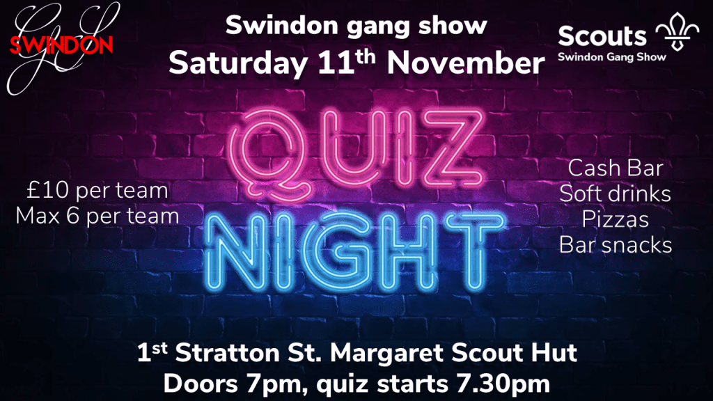 We are running a quiz night on Saturday 11th of November at 1st Stratton St Margaret Scout hut. We have lots of refreshments to keep you going including alcoholic and soft drinks, bar snacks and freshly made pizzas and garlic bread!
